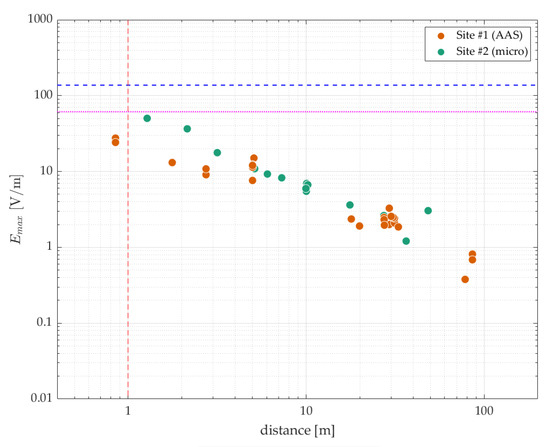 Theoretical maximum exposure levels Emax (in V/m) obtained at two sites with a 5G new radio (NR) base station—scaled to small-cell powers [2,3]—as a function of the distance to the antenna. Only positions within the scanning range of the base station radio are featured here. Maximum permissible exposure (MPE) limits issued by ICNIRP [17] are indicated by the blue dashed line (occupational) and the magenta dotted line (general public). The red dashed line indicates the boundary between occupational (<1 m) and general public exposure (>1 m) (see Dm for E100 in Table 1).
