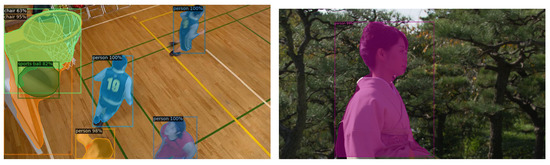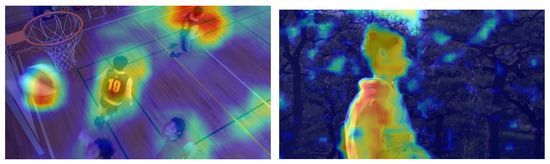 Accurate extraction of high-level semantic features of videos helps to better visual attention modeling. On that basis, this paper uses grad-CAM for the extraction of high-level semantic features. In this network, the further the layer, the ampler the semantics is and the more spatial information can be preserved. In this respect, grad-CAM contains all the semantics of our target of interest. For more details, please see [48]. With grad-CAM, we can draw heat maps which are shown in Figure 1 below. Moreover, to effectively utilize the various properties of semantic objects, this paper uses VNext [49] to extract semantic objects, and the results are shown in Figure 2.