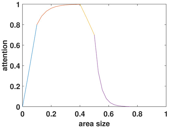 where , N is the number of semantic objects in an image frame, represents the size of semantic object, which is calculated as: , represents the number of objective pixels, and refer to the width and height of the image frame. Figure 4 shows the relationship between area and attention.