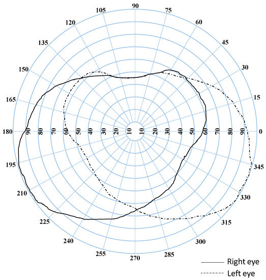 As the contextual complexity of the target suppresses the attention strength, the more complex the pattern of the background, the stronger the suppression, while this is going on, the findings of numerous human visual field experiments indicate that the human binocular visual field is approximately circular (oval), with the proximate form depicted in Figure 7 [58]. Hence, to represent the inhibition of each semantic target background, we utilize the average of the contextual complexity in the circumcircle of semantic targets to simplify the calculation. Since entropy reflects the chaotic degree of a system, we estimate contextual complexity by local entropy. As a result, attention and contextual complexity are related in the following way.
