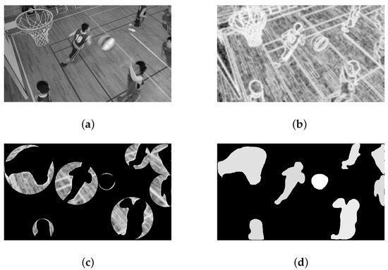 (a) The 212th original frame of the “Basketball Drill”; (b) The complexity map of the whole frame; (c) The contextual complexity map of the semantics; (d) The inhibitory effect of contextual complexity on semantics.