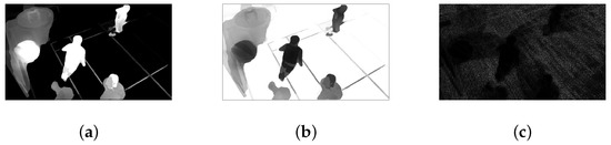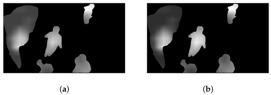 Figure 12a,b display the obtained attention map and the corresponding weight map. Figure 12c shows the final spatio-temporal JND threshold map. In Figure 12a,c, brighter areas indicate higher visual attention or masking, while the opposite is true for Figure 12b.