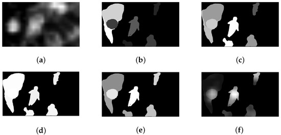Figure 10a–c takes the 2nd frame of the ”Basketball Drill” sequence as an illustration, showing the attention map of semantic sensitivity, objective area and central bias. Figure 10d displays the inhibition effect of the contextual complexity. Figure 10e shows the attentional competition result. Figure 10f exhibits the final attention map. Intuitively, brighter areas indicate higher attention, inhibition and competition.