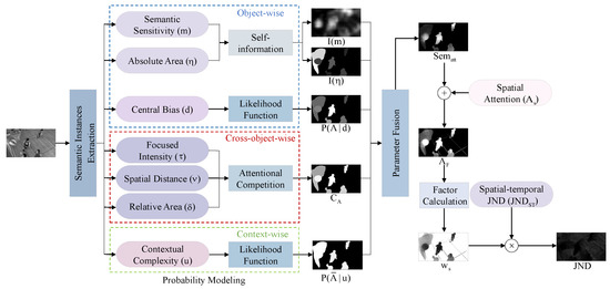Specifically, inspired by the framework of [23], this paper proposes a statistical probability model corresponding to the feature parameters and quantifies the response of visual attention in a perceptual sense using information theory. Then, the attentional competition factor for calibrating the semantic attention model is proposed. Finally, the adaptive semantic attention weight is obtained by unifying and fusing the perceptual feature parameters, and the JND model is adjusted using this weight.