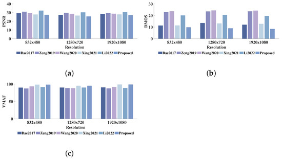 The detailed performance results of different JND models are shown in Table 1. From the panoramic viewpoint, it can be found that the proposed JND model has the best performance on PSNR and DMOS for all videos except the “RaceHorses” sequence. This is mainly due to the large proportion of foreground semantic objects in the “RaceHorses” sequence, while our model guides only a small amount of noise into the foreground semantic object region. Therefore, the PSNR value of the proposed JND model is slightly higher than this of Xing, 2021. In addition, as shown in Table 2, the Video Multimethod Assessment Fusion (VMAF) scores [69] of the noise-contaminated videos of different JND models are measured, and the proposed model obtains optimal or suboptimal scores. The larger VMAF scores indicate that the subjective quality of the noise-contaminated sequences is closer to that of the original sequences. The results in Table 2 further verify the superiority of the proposed model in the VMAF metric scenario. Meanwhile, the average PSNR values of Bae 2017, Zeng 2019, Wang 2020, Xing 2021, Li 2022 and the proposed JND profile are 28.36 dB, 30.08 dB, 28.90 dB, 27.83 dB, 30.95 dB, and 27.03 dB, respectively. The average DMOS values of these are 12.49, 23.47, 24.08, 12.51, 19.59 and 9.42, respectively. The average VMAF values of these are 90.09, 87.71, 90.98, 97.30, 88.96 and 97.39, respectively. To visualize the data, Figure 15 displays the bar graphs of the average PSNR, VMAF and accompanying DMOS results for test sequences of various resolutions. Apparently, the noise-contaminated video generated by our model achieves the best perceptual quality (smallest DMOS score) and the largest distortion (lowest PSNR value) compared to the other four models. These experimental results validate the superiority of our JND profile in guiding noise injection.