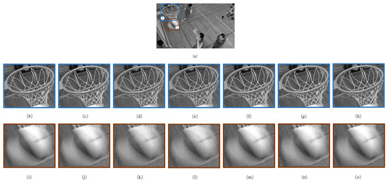 As mentioned in the introduction, high-level semantic objects other than humans often appear in image and video frames. Frame 70 of the “Basketball Drill” sequence is depicted in Figure 17 as an illustration. Clearly, this is a scene depicting basketball training. Naturally, in this case, the basketball and the ball frame are obviously of interest in addition to the basketball players. With respect to the basketball frame, Figure 17c–g show significant distortion, while Figure 17h exhibits strong performance. For the basketball, Figure 17j–l,n depict considerable distortion, Figure 17m shows significant distortion at the lower right of the basketball, while the noise in Figure 17o is barely visible.