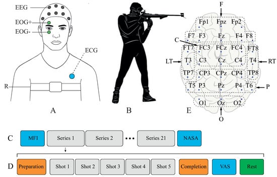 (A) Experimental setup with sensors: EEG (grey circles), EOG (green circles), ECG (blue circle), respiration (white stripe); (B) Shooting stance; (C) General design of the experimental session; (D) Design of individual series; (E) Scheme of EEG electrodes placement “10-10”. Chosen areas of EEG signals averaging are shown with dotted frames: frontal (F), central (C), parietal (P), occipital (O), left temporal (LT), and right temporal (RT).