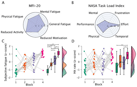 Results of the behavioral data analysis: (A) Median values for the scales of MFI-20 in the group of subjects; (B) Median values for the scales of NASA-TLX in the group of subjects; (C) Subjective fatigue (z-score); (D) Hit rate (z-score). Dots correspond to individual subjects, while box and whisker plots show values averaged over the blocks of the experiment. The symbol * denotes statistical significance in post hoc analysis using t-test with Holm’s correction for multiple comparisons (*—, ***—).