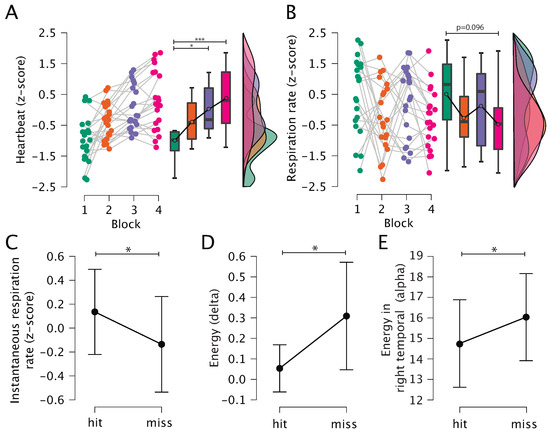 Results of the physiological data analysis: (A) Heartbeat at the rest phase (z-score); (B) Respiration rate during the shooting phase (z-score); (C) Instantaneous respiration rate corresponding to the shot time for hit and miss; (D) Average energy value in delta range before the shot for hits and misses; (E) Average energy value in the right temporal lobe in the alpha range before the shot for hits and misses. Dots correspond to individuals subjects while box and whisker plots show values averaged over the blocks of the experiment. The symbol * denotes statistical significance in post hoc analysis using t-test with Holm’s correction for multiple comparisons (*—, ***—).