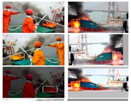 The model trained with YOLOv6 networks exhibits high efficacy in determining firing targets. We employed the YOLOv6 model to detect minuscule targets of fire and graphically present the findings. The small target fire dataset only contains images from the validation dataset, which are the targets of the firing. Figure 7 displays the final image detection results after YOLOv6 was validated in over 30 verification examples. In comparison to YOLOv3 and Faster R-CNN, whose detection results only show partial targets, YOLOv6 can identify all of the fires and smoke present in the image.