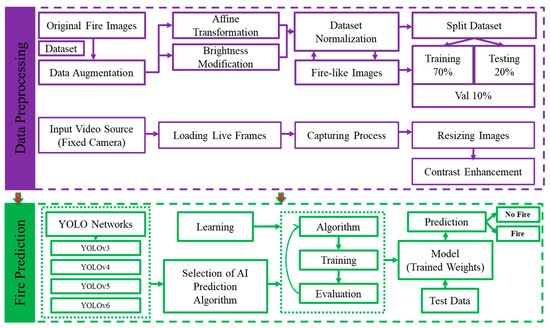 We divided the fire detection and classification procedure into two parts, as shown in Figure 3. The section on data processing describes dataset gathering and enhancement using various data augmentation techniques. The selection of a suitable YOLO model to use for fire detection is the main goal of the fire prediction stage. We decided to utilize the YOLOv6 network for the efficient identification and warning of fire disasters after training and testing the default YOLO approaches in fire detection instances.