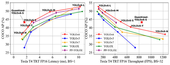 There are multiple model sizes available in YOLOv6 (N, T, S, M, and L) to optimize the performance trade-off depending on the scenario’s industrial application. Furthermore, some bag-of-freebies techniques, such as identity and additional training epochs, are introduced to further enhance performance. To achieve maximum efficiency in an industrial setting, we use QAT in conjunction with channel-wise distillation and graph optimization. YOLOv6-N achieved 35.9% AP on the COCO dataset with 1234 FPS on T4, while YOLOv6-S and its quantized version achieved 43.5% AP and 43.3% AP at 495 FPS and 869 FPS, respectively, on T4. Similar to YOLOv6, YOLOv6-T/M/L exhibits maximum performance, with superior accuracy compared to other detectors of comparable inference speed, as shown in Figure 4 [40].