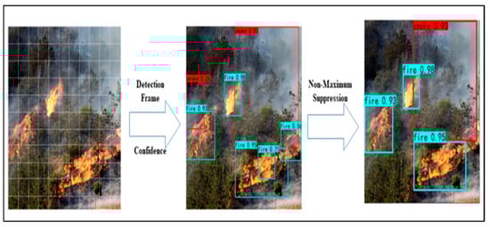 The YOLOv6 model only has a single detection step. The following is a detailed account of how fires may be detected using YOLOv6. If the target to be identified lies within an S 2 grid, that grid is responsible for determining the object to be detected. The network begins by dividing the input fire picture into S grids. Following this, one grid provides predictions for three bounding boxes, along with confidence values for these predictions. In this context, “confidence calculation” means: