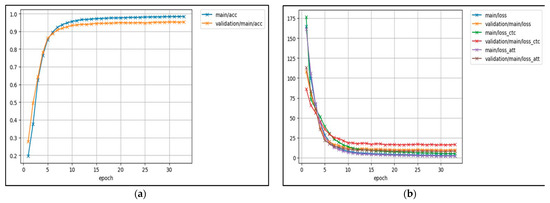 The training processes of the proposed method: (a) accuracy vs. epoch and (b) validation loss vs. epoch during network training.