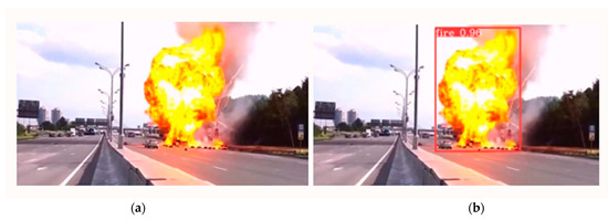 Fire scenarios included experiments: (a) input image and (b) output image with fire detected region.