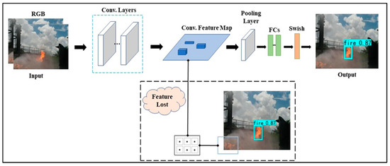 A convolutional set made up of five convolution layers with alternating 1 × 1 and 3 × 3 kernels processes the feature map to extract higher-level features extracted from a tiny target. Once the activation function is applied, the accumulation layer is utilized to transform the high-dimensionality between one vector. The most likely classification outcome is then chosen as the extracting features network output after these vectors are fed into the activation function. Targeting the feature extraction network’s inability to strike a good balance between depth, width, and resolution, this paper proposes using the enhanced Efficient Net extracting features network only on the fire dataset to remedy the former’s shortcomings in tiny target detection and boost the latter’s feature extraction capacity. The capacity to learn minute target characteristics is augmented and the effectiveness of a network for extracting features from small targets is improved, thus enabling the processing of small target images.