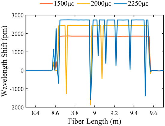 Wavelength shift calculated by cross−correlation algorithm at strains of 1500, 2000, and 2250 με.