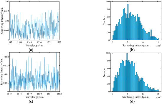 Following is an experimental description of the supplementary spectra constructed by using the spectra model of Rayleigh backscattering light. We take the data of 1000 με as an example; Figure 4a,b shows the spectra and their distribution obtained by experimental collection. Figure 4c,d shows the training spectra and their distribution, in which the training spectra are composed of the reference spectra and the supplementary spectra. The reference spectra are 0 με data acquired by the OFDR system. The supplementary spectra are composed of the spectra model of Rayleigh backscattering light based on a theoretical wavelength shift of 1000 με. Training spectra are obtained by stitching the supplementary spectra and a part of the reference spectra. As can be observed from the figures, the collected and training spectra basically obey the Rayleigh distribution, which is consistent with the theoretical basis of OFDR. At the same time, in this manuscript, we determine whether the training spectra satisfy the fundamentals of the OFDR system by fitting the relationship between the average free spectra range (FSR) and spatial resolution. The average FSR refers to the average distance between adjacent spectral peaks of Rayleigh scattering spectra, and based on the principle of Michelson interference, the expression of FSR is