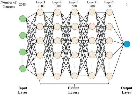We used traincgf as the training function and satlin as the activation function and ran the network ten times consecutively to obtain the effect of different hidden layers of the neural network on the accuracy rate, as shown in Figure 8. Figure 8a shows the accuracy rates after running ten times, and we can observe that the average accuracy of the 5-hidden-layer, 6-hidden-layer, and 7-hidden-layer networks is relatively close. Therefore, we compared the training time of these three networks with different layers, as shown in Figure 8b. Training time is the time used by the MLP model during the training phase. We found that the training time of the 5-hidden-layer network was the shortest. In the final classification model, we set the learning rate to 0.005, the training function to traincgf, the activation function to satlin, the number of hidden layer layers to five, and the loss function to mean square error. Figure 9 shows the MLP with the five-hidden-layer network structure. Green circles represent input layer neurons, light yellow circles represent hidden layer neurons, and blue circle represents output layer neuron. The input layer of the MLP is the OFDR spectra with a dimension of 2048. After the input layer, there are five hidden layers, and the number of neurons in each hidden layer is 2000, 1000, 500, 200, and 50, respectively. Once the data are processed by the hidden layer, they are passed to the output layer of the MLP to output the result.