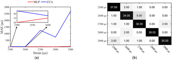 (a) Mean absolute error of multilayer perceptron and cross-correlation algorithm at strain from 2500 to 2900 με; (b) confusion matrix of multilayer perceptron.