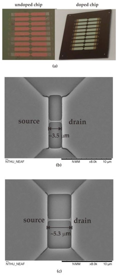 After fabricating the nanowire devices, the devices were covered with a 10% (v/v) ethanol solution of 3-aminopropyltriethoxysilane (APTES) for 15 min at room temperature. The solution was then removed and baked at 100 °C for 45 min to modify the nanowire’s surface. To covalently immobilize GOx on SiO2, 0.01% suberic acid bis(3-sulfo-N-hydroxysuccinimide ester) sodium salt (BS3) was mixed in 10 mM phosphate buffered saline (PBS) solution, and the mixture covered the nanowire surface for 30 min at room temperature. The modified surface was covered with a 150 µg/mL GOx solution at pH 7 for 1 h. Unreacted aldehyde groups were quenched by immersion in 15 mM Tris buffer solution for 15 min at room temperature [20]. Figure 2a shows the photographs of the NWGS with doped/undoped process and the top-view SEM images of NWGS with various lengths are shown in Figure 2b,c. It is clear that the length of the nanowire is well controlled at around 3 μm and 5 μm.
