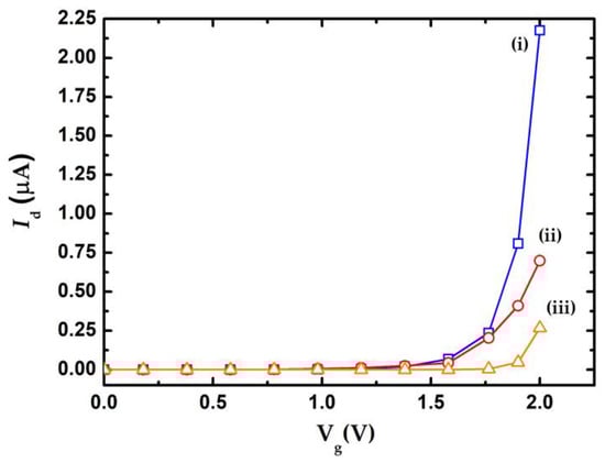 The electrical behavior of nanowire can be described using the Id-Vg and Id-Vd curves. Different physical dimensions and dopant properties of the nanowires lead to different Id-Vg curve behaviors, indicating that the appropriate geometry and dopant concentration of the nanowires exhibited high sensitivity for biosensing purposes. Eflstrom et al. [12] indicated that the device sensitivity increased with decreased nanowire width. Previous work [20] reported that the threshold voltage and resolution of nanowires increased with increasing nanowire length. Cui et al. [22] showed that the resistivity of n-type nanowires exhibited more than 4 orders of magnitude smaller than the undoped nanowires. They also pointed out the n-type nanowire exhibited lower Fermi level when operated at the Vg > 0 condition, in which electrons will accumulate in nanowire and enhanced conductivity. These enhancements might be increasing the sensitivity of nanowire. This work simulates the Id-Vg curve of the nanowire under various dopant concentrations using commercial software (Synopsys, TCAD) by setting of the nanowire length and width to be 3 μm and 150 nm, respectively. The drain voltage was 0.5 V. Figure 3a indicates that the Id-Vg curve of various dopant concentrations of the nanowire, in which the curves (i) to (iii) corresponded to dopant concentration 1 × 1018 cm−3, 1 × 1017 cm−3, and undoped, respectively. Higher dopant concentration of the nanowire implies a larger variation of drain current.