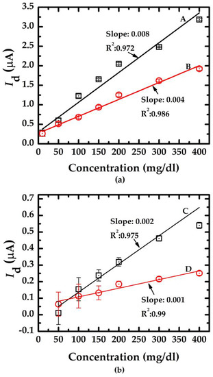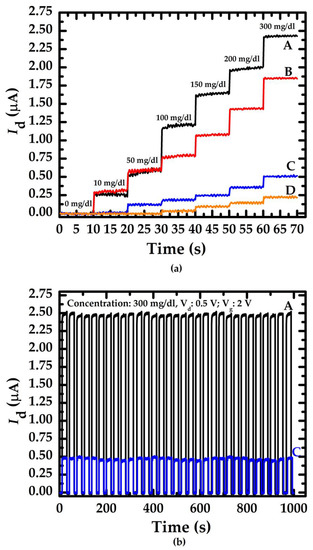 The repeatability of the proposed sensor was verified by performing 30 consecutive measurements on a glucose concentration of 300 mg/dL, where sensors A and C were selected for comparison, as shown in Figure 6b. The average values of Id of sensor A and C were 2.41 μA and 0.45 μA, respectively. Moreover, the standard deviation (SD) of Id corresponding to each sensor was 0.06 and 0.14, respectively. Clearly, Figure 6b shows that the current-time response curves exhibit high similarity in 30 consecutive applications of each sensor.