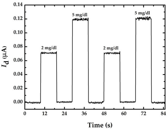 Figure 7 shows the smallest glucose concentration measurement with sensor A. The results show that the difference of Id between 5 mg/dL and 2 mg/dL is about 50 nA. Considering the resolution of the current meter (0.1 nA), sensor A should theoretically be able to measure a change of 1 mg/dL. Therefore, the proposed sensor with short nanowire length and n-type doping has a high possibility of measuring the glucose concentration below 1 mg/dL.