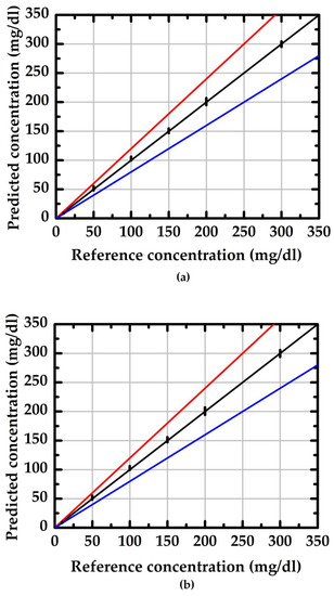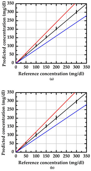 where SD is standard deviation and is the average value of the measured data. Using doped/undoped NWGS and a traceable refractometer (reference method, model: excellence R4, Mettler) to conduct 30 groups of measurements, the evaluation results are shown in Figure 8 and Figure 9. The values in the region between the red and blue lines indicate the measurement result within 20% of the reference concentration. The average RSD of the doped type NWGS with lengths of 3.5 μm and 5.3 μm are 4% and 5%, respectively. The average RSDs for undoped NWGS are 9% and 10%, respectively. These results demonstrate good reliability of the proposed method for both types of NWGS and satisfied the minimum requirement (±15%) for point-of-care devices provided by the Food and Drug Administration (FDA) [25].