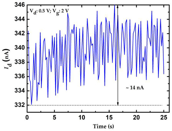 where S is the slope of the calibration curve; and ∆I and Cres represent the resolution of the current measurement and glucose concentration, respectively. Resolution of the measured current depends on the current meter. The resolution of the current meter is 0.1 nA which can be considered as the theoretical resolution of the proposed method. There are many issues that can reduce the resolution of amperometric measurement, such as the temperature variation, conductivity fluctuations of the electrodes, and unwanted electrical noise from the measurement equipment. To evaluate the practical resolution of the measured current of the proposed system, the current fluctuation of the proposed system can be considered by applying a constant Vg to the DI water sample. In this work, the current fluctuation is approximately 14 nA within 25 s and the results are shown in Figure 11. According to Equation (2), the resolution of these sensors can be calculated and are shown in Table 1. Clearly, doped NWGS exhibited higher resolution than undoped NWGS, and the resolution of NWGS with shorter nanowire length was higher than that of NWGS with longer nanowire length. An n-type dopant sensor with a nanowire length of 3.5 μm can achieve the optimum resolution for the proposed sensor which is approximated of 1.75 mg/dL.