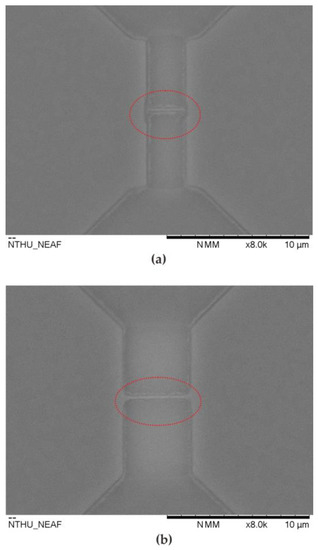 Top-view SEM images of the proposed sensor after 40 applications. (a) doped type nanowire sensors with lengths of 3.5 μm; (b) doped type nanowire sensors with lengths of 5.3 μm.