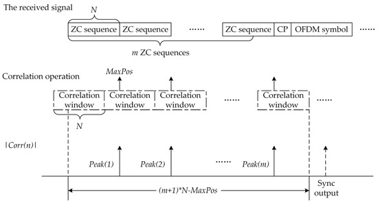 The proposed method is composed of two stages. In the first stage, the ZC sequence that makes up the preamble is used as the coefficients of the correlator. The received signal is then input into the correlator to perform a correlation operation with the ZC sequence. Finally, the correlation value signal is output. In the second stage, the correlation value signal is used for synchronization detection. The schematic of the proposed method is shown in Figure 3.