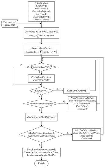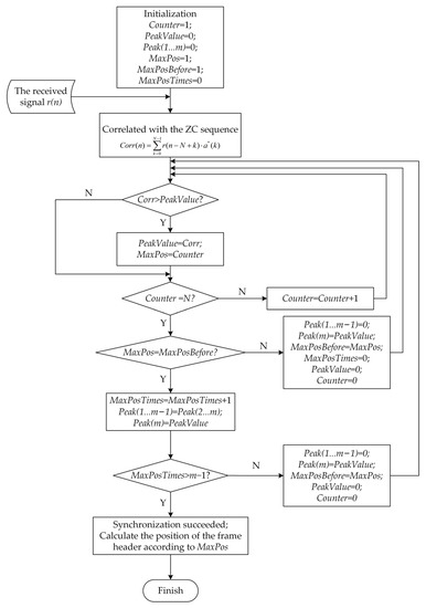 As can be seen from Figure 6, the peak value of first increases and then decreases. If the position of the maximum correlation peak can be found, the position of the frame header can be calculated accordingly. The process of the ACPD algorithm is as follows:
