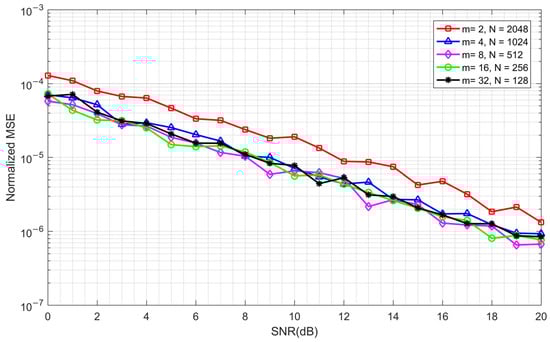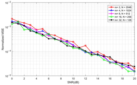 In a practical communication system, a preamble is usually added before each frame of data to be sent at the transmitter. At the receiver, the received signal is correlated with the local sequences, and the exact position of the frame header is determined by detecting the correlation peak. PN sequences are often used as a preamble. CAZAC sequences have better autocorrelation and cross-correlation properties than traditional PN sequences. As can be seen from Equation (5), the correlation peak value is proportional to the length of the CAZAC sequences; therefore, it is easier to detect the frame header with a longer preamble. On the other hand, the existence of CFO will affect the performance of correlation peak detection. The longer the preamble, the greater the influence of CFO; therefore, it is better for the preamble to be shorter.