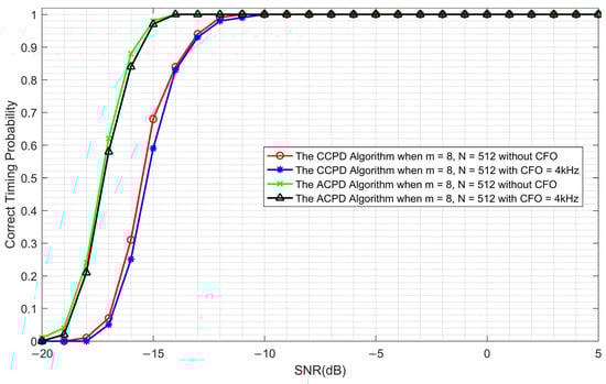 It can be seen from Figure 13 that the existence of CFO weakened the performance of both the CCPD algorithm and the ACPD algorithm; however, its impact is negligible. Furthermore, under the same correct timing probability, the ACPD algorithm has a performance improvement of 2 dB to 3 dB, when compared with the CCPD algorithm.