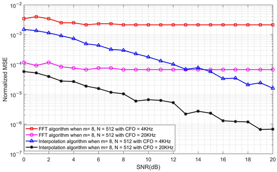 The CFO estimation performance of the FFT algorithm and the quadratic interpolation algorithm is simulated and compared. The number m of ZC sequences is 8, the length N is 512, and CFOs are 4 kHz and 20 kHz, respectively. The simulation results are shown in Figure 15.
