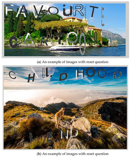 To guarantee that the user does not forget about all of the parts of his/her password (the image part, and the reset question part), password reset questions will appear embedded on the image in CAPTCHA-like letters.