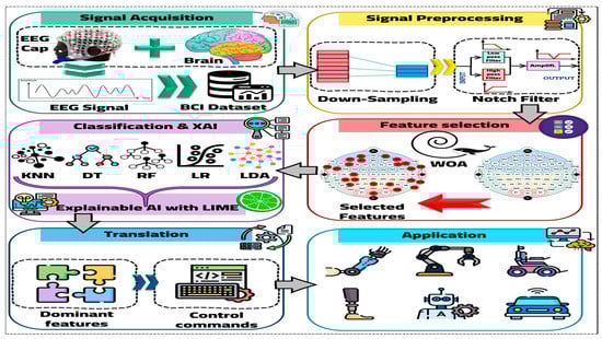 This paper proposes an innovative and improved machine learning-based BCI system that analyzes EEG signals obtained from MI to distinguish among various limb motor tasks based on the dataset above—starting from signal acquisition, which is the process of recording neural activity. One of the most popular data acquisition techniques utilized in BCI systems is EEG due to its portability, affordability, and simplicity [21]. Signal preprocessing is used to improve noisy signals and eliminate abnormalities, which may include interference from power lines and body movement [22]. As reported by the dataset owners, a notch filter was already implemented in the system. The suggested framework pipeline consists of the following significant steps: (1) using a WOA feature selection technique to find the ideal discriminating features, (2) modeling numerous well known machine learning classifiers, including LDA, k-NN, decision tree (DT), random forest (RF), and logistic regression (LR), and (3) the Explainable AI (XAI) technique was used for further explanation of features contribution towards the final classification. A schematic illustration of the proposed framework is shown in Figure 2.