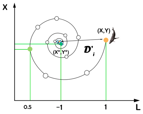 Spiral updating position: this methodology begins by figuring out how far apart the prey at (X*, Y*) and the whale at (X, Y) are from one another. The following equation establishes a spiral relationship between the position of the whale and its prey to replicate the humpback whales’ helix-shaped movement [38], as seen in Figure 5.