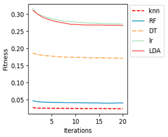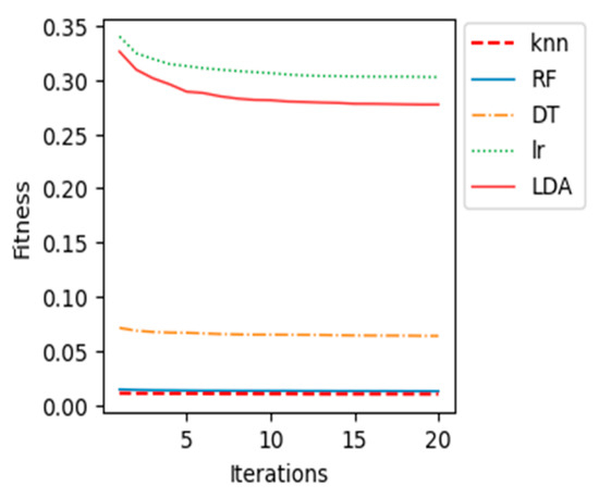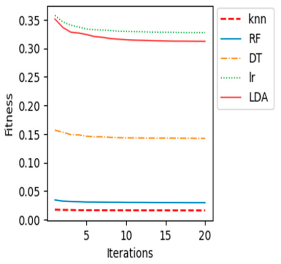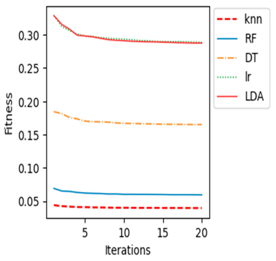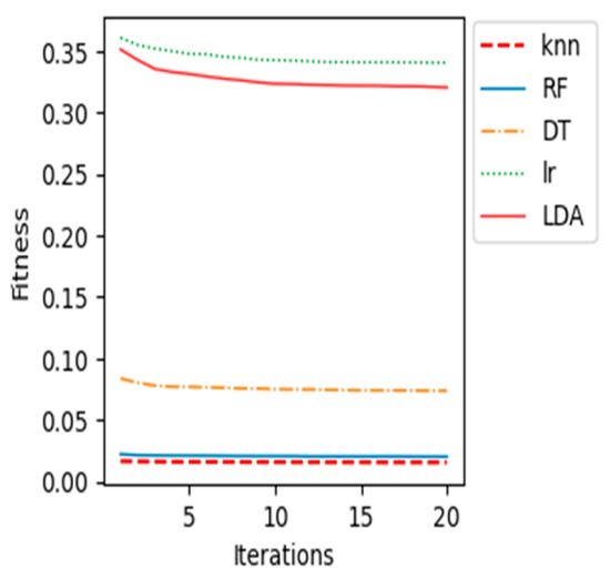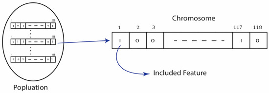 Each feature subset in WOA can be considered a whale’s position. The better the solution, the fewer features there are, and the higher the classification accuracy. Each solution is assessed using the suggested fitness function, which considers two criteria: the accuracy of the solution as determined by the classifier and the total number of features included in the solution [39]. An illustrative example is shown in Figure 6.