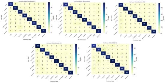 Among all of the tested CNN methods, we used 100 epochs per model and calculated the training time. The lightweight MobileNetv2 obtained the lowest training time with only 6.1 h; however, DenseNet201 finished the 100 epochs in 11.9 h. Figure 6 shows detailed information on the experimental results of the CNN training with the confusion matrix.