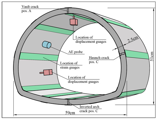 Most guidelines on how cracks influence the structural capacity of concrete lining are based on empirical knowledge, but few scientific studies have been devoted to the risk of cracks in tunnel linings. However, Su et al. [28] investigated how pre-existing cracks affect the structural capacity of an unreinforced concrete ring by performing 1:10-scaled tests in a laboratory environment. The tunnel section was subjected to uniform pressure, and cracks with a 600 × 0.2 × 10 mm (length × width × depth) were introduced in the model before loading. Every model contained one crack, and the failure load was investigated using four different crack locations and compared with an uncracked model, see Figure 4.