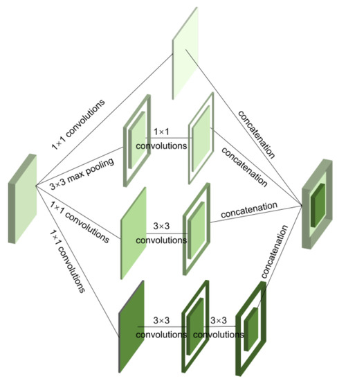 The increase in the depth and width of a network can improve its performance, but the cost of larger network parameters and a heavier load of calculation easily lead to overfitting. The inception structure proposed by Szegedy et al. [43] operates and integrates the feature map input from the previous layer by using convolution kernels and pooling operations of different sizes in the same layer to obtain a new feature map. This increases the width of the network but, at the same time, by the use of 1 × 1 convolution, it reduces the number of parameters and avoids excessive calculation in each layer. Therefore, the inception block is often used in computer vision studies. Many scholars have combined inception blocks with U-Net architecture and have proposed various image segmentation models. For example, Ibrahim et al. [44] added inception blocks to U-Nets to increase the network width and developed a new network structure aided by the feature extraction ability of inception blocks to improve building detection. Zhang et al. [45] integrated the inception block into U-Net, used the Res-inception module to replace the standard convolution layer to increase the width of the network, and used the inception block to extract features to build a deeper network structure and achieve higher performance than the existing algorithms. In addition, inception blocks have been applied in many computer vision applications, such as facial recognition [46], lithography hotspot detection [47], handwritten letter recognition [48], and breast cancer detection [49], with good results.