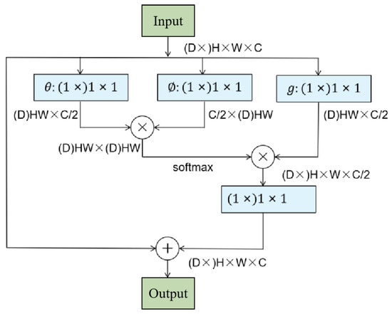 where X represents the input data (in this study, it refers to the three-dimensional image block of the input network), y represents the output data, and i and j represent the spatial positions of the input. f is a function used to calculate the similarity relationship with all other data, and g is used to calculate the eigenvalue of the input data at the position. c ( X ) is a normalization parameter. To simplify the problem, only the linear   g ( X j ) case is considered; that is, g ( X j ) = W g X j   .   W g   is a weight matrix that can be learned through training, which, depending on the input data, can be implemented in the neural network by the convolution operations of 1 × 1 or 1 × 1 × 1. There are many choices of functions. Here, we implement the embedded Gaussian, the formula for which is as follows: