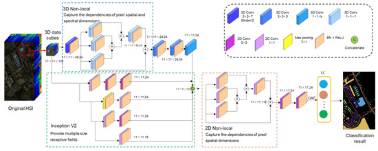 Because the input data have not been processed by dimension reduction or band selection, the spectral dimension contains much redundant information. Therefore, the input data first pass through a layer of spectral dimensions with a step size of 2 and a convolution kernel size of 3 × 3 × 7 to gather spectral information and simultaneously extract spatial–spectral joint features of input data to enhance salient features and suppress redundant data through 3D nonlocal modules. Then, we use a 2-layer 3 × 3 convolution layer to further extract spatial features and a 1-layer 1 × 1 × K convolution to obtain a 2D feature map.