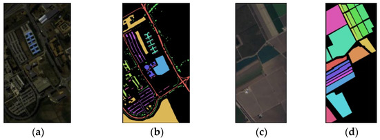 Figure 4. PU and SA dataset pseudo-color images and ground truth: (a) pseudo-color image of PU, (b) ground truth of PU, (c) pseudo-color image of SA, (d) ground truth of SA.