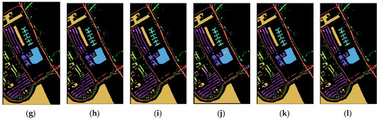Figure 5. Classification effect of different algorithms on the PU dataset: (a) 2D-CNN, (b) 3D-CNN, (c) HybridSN, (d) Two-CNN, (e) Hamida, (f) PResNet, (g) M3D-DCNN, (h) FDSSC, (i) SSRN, (j) SSAN, (k) 2-3D-NL CNN. (l) The ground truth.