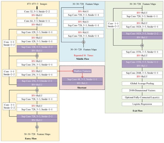- Feature Extraction: As the basic structure of the semantic segmentation network, the feature extraction module directly determines deep-level semantics and low-level appearance information embedded in the extracted feature maps. Most semantic image segmentation networks employ classic networks such as VGG [], ResNet [], and Xception [] as backbones for feature encoding and integration. These networks have demonstrated excellent performance in various recognition problems based on the large-scale ImageNet benchmark [] and prove the abilities of feature representation and aggregation. In addition, these networks have a powerful transfer learning ability by loading a pre-trained ImageNet model to accelerate convergence and improve network performance. As light-weighted Xception is more efficient and exhibits powerful encoding ability compared with VGG and ResNet, in the proposed EDPNet, we adopt Xception as a backbone for initial feature extraction and representation. Inspired by works [,], we enhance the original Xception module to further strengthen the feature encoding ability. The enhanced module, called Xception+, includes the following significant enhancements: (i) The original Xception network uses downsampling operators such as stride convolutions or pooling layers to encode the feature representations. While these enlarge the receptive field size to perceive high-level semantics, they also increase the loss of spatial information, especially for deep feature maps. To guarantee a large-sized receptive field and relieve the spatial information loss, we substitute the Xception’s pooling structures with depthwise separable convolutions with 3 × 3 filters and a stride of 2 to retain more details. The changes are illustrated by rectangles with purple backgrounds in Figure 2. (ii) We draw out a shortcut block from “Entry Flow” block in Figure 2 to retain shallow features with detailed appearance information and make fusions with encoder outputs (see Figure 1) with rich semantics.Figure 2. Feature map extraction by an enhanced Xception network called Xception+. Note that our enhanced blocks are highlighted by the purple backgrounds. We add the shortcut block, which aims to retain shallow feature maps and decrease the number of feature channels.
