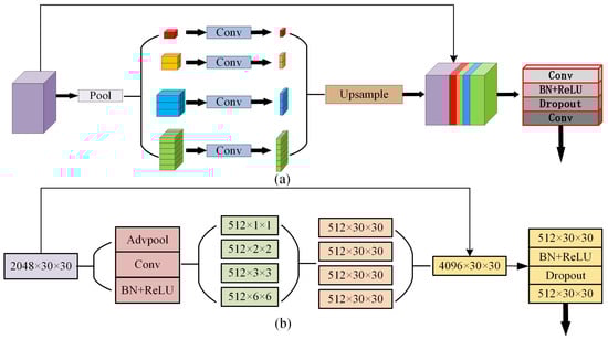 Pyramidal pooling module (PPM) proposed by Zhao et al. []. Subfigure (a) represents PPM structural modules, and (b) corresponds to the feature maps of the PPM.