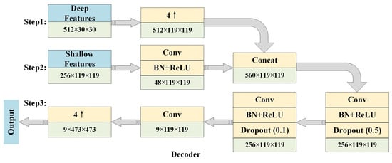 In our EDPNet, we use the proposed encoder to shrink the input images into 1/16 feature maps of the original size with 512 channels. 4× bilinear interpolation is followed to obtain 1/4 dimension of the input to finalize the encoding process. The encoded feature maps are then put into the decoding step where shallow feature maps of the same dimensions are concatenated with the encoded features to form aggregated feature maps of dimension 560 × 119 × 119. The aggregated feature maps are deeply fused through three successive convolutions and one pool operation to learn feature maps with rich semantics and spatial contextual details. The detailed decoding process is shown in Figure 4.